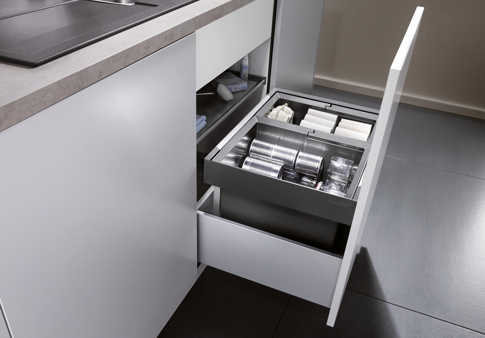 Organizatorul BLANCO este soluția ideală pentru utilizarea inteligentă a spațiului din dulapul de sub chiuvetă. Proiectat special pentru a se integra perfect cu chiuvetele și bateriile BLANCO, acesta oferă organizare optimă și acces facil la toate componentele din dulap. Montajul simplu și instrucțiunile clare permit instalarea rapidă.